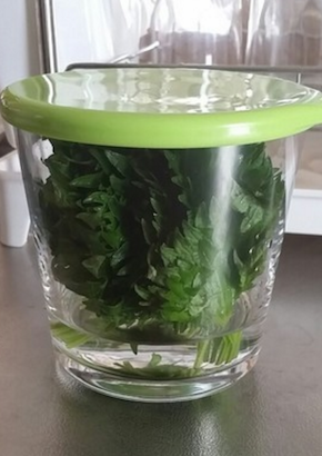 しそも同じく、下の軸の部分だけ水に浸けてこのように保存すると